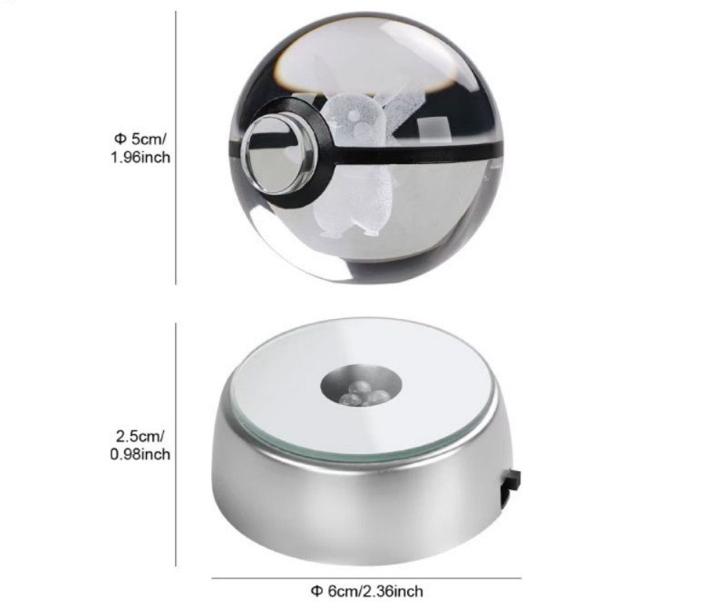 Base Iluminada con Luz LED: La esfera se asienta sobre una elegante base plateada que emite una luz LED azul brillante, iluminando la figura de Pokémon y creando un efecto visual cautivador, especialmente en la oscuridad.